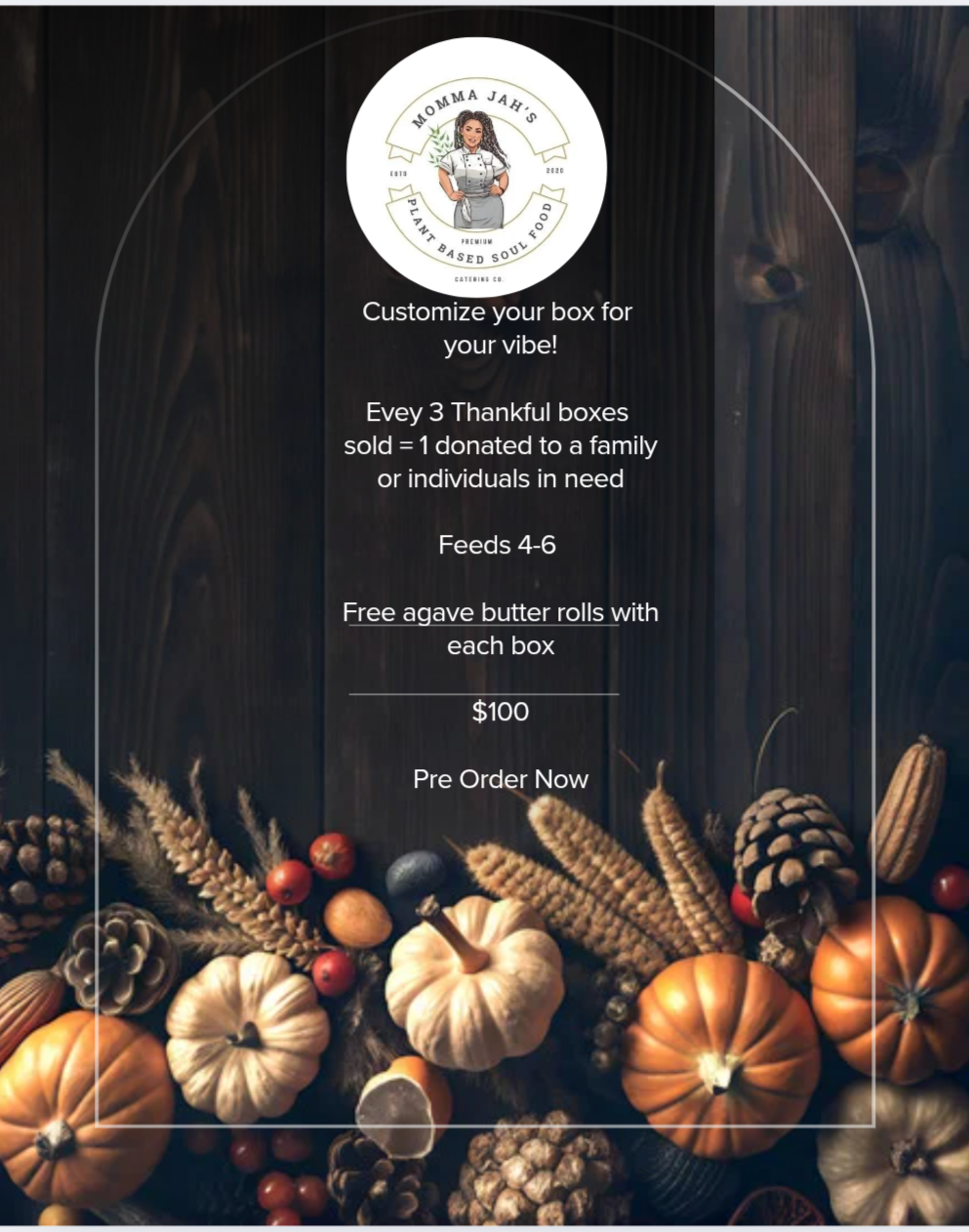 This year take the load off and let Momma Jah Take care of you and yours. Pick any 3 items to build your box. I make you bake. Each Box features 4-6 servings of each option of your choosing. For every 3 boxes sold, 1 box will be donated to a family or individuals in need. Pick up Nov 24th, 25th, & 26th.